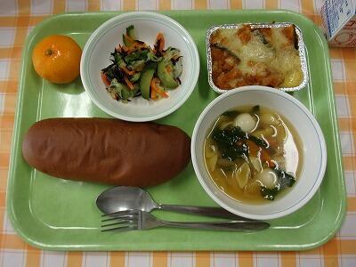 牛乳 黒パン かぼちゃのミートグラタン ひじきのマリネ マカロニスープ みかん