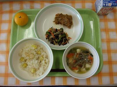 牛乳 さつまいもご飯 鶏肉のねぎみそ焼き ひじきと切干大根のサラダ かぶのみぞれ汁 みかん