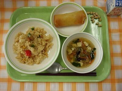 牛乳 ナシゴレン 鮭とチーズの春巻き揚げ 春雨スープ いり大豆