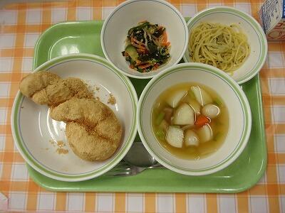 牛乳 きなこ揚げパン ツナとわかめのサラダ スパゲティバジリコ ポトフ