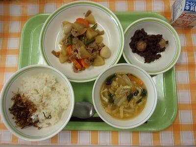 牛乳 ご飯 アーモンドと小魚の佃煮 豚肉と大根の煮物 白菜ときのこのみそ汁 白玉あずき