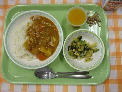 牛乳 夏野菜のカレーライス コーンサラダ サイダーポンチ 大豆小魚