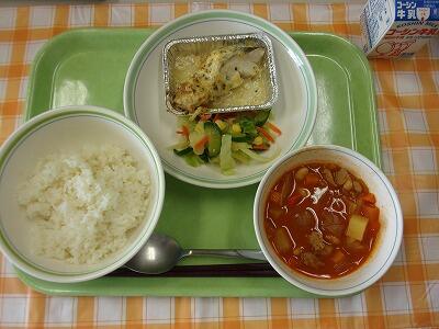 牛乳 ご飯 鰆のカレーソースかけ ごま和え 肉じゃが 豆腐とわかめのみそ汁