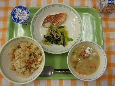 牛乳 しめじご飯 赤魚の塩こうじ焼き ごま和え 呉汁 ヨーグルト