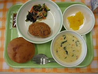 牛乳 丸パン 白いんげん豆入りコロッケ ツナとわかめの和え物 米粉のコーンポタージュ 甘夏みかん缶