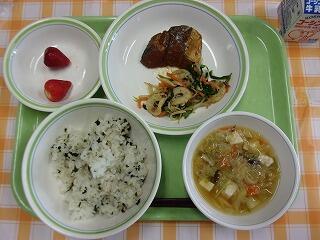 牛乳 わかめご飯 鯖のみそ煮 ほうれん草とちくわの和え物 具だくさんすまし汁 いちご