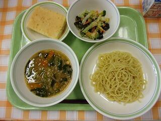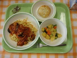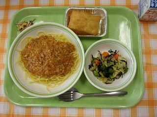 牛乳 スパゲティ大豆ソース ひじきとじゃがいものサラダ アップルパイ カシューナッツ小魚