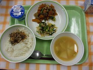 牛乳 ご飯 手作りふりかけ 鶏肉とかぼちゃの甘酢炒め おひたし かぶのみそ汁 ヨーグルト