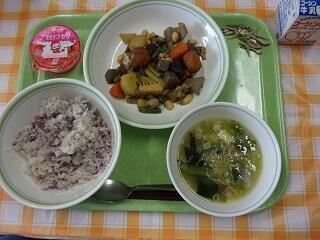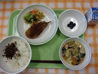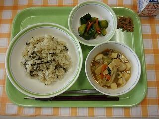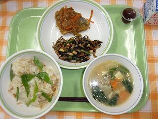 牛乳 ひじきと青大豆のご飯 ほっけの一夜干し キャベツときゅうりのごま酢和え みそけんちん汁 メープルカシューナッツ