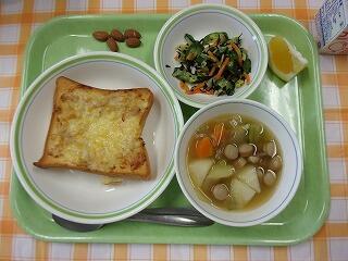 牛乳 ツナコーントースト ポトフ ひじきのマリネ アーモンド 美生柑