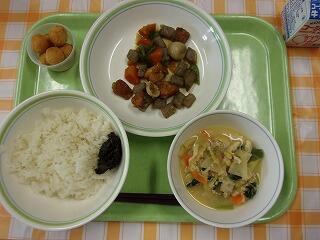 牛乳 ジャージャー麺 いかの中華スープ 豆腐ドーナツ 小魚