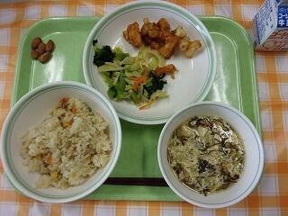 牛乳 コーンチャーハン いかのかりんとうがらめ 三色和え もずくと卵のスープ アーモンド