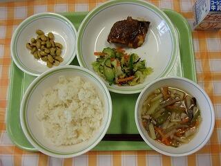 牛乳 ご飯 鯖のピリ辛焼き キャベツときゅうりのごま酢和え 大豆の磯煮 けんちん汁