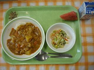 牛乳 ポークカレー ゆで野菜のごまサラダ すいか 小魚