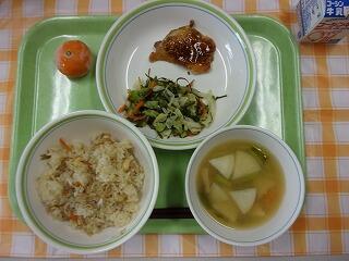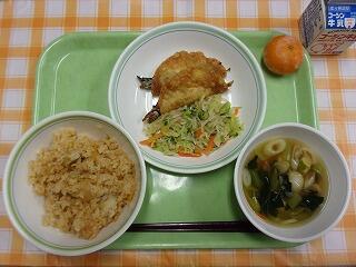 牛乳 わかめとコーンの炊き込みご飯 鰆の立田揚げ かぶのナムル 豚肉と野菜のみそ汁 冷凍みかん アーモンド小魚