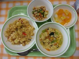 牛乳 パエリア カリカリ大豆のサラダ チーズスープ フルーツ白玉