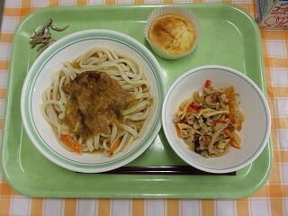 牛乳 冷やしきつねうどん 豚肉の千切り炒め パイナップルケーキ 小魚
