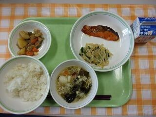 牛乳 ご飯 鮭の照り焼き にらともやしのサラダ 野菜のごま煮 すまし汁