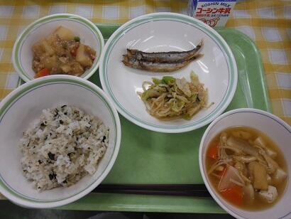 牛乳・わかめごはん・ししゃもの唐揚げ・アーモンド和え・じゃがいものそぼろ煮・えのき茸の味噌汁