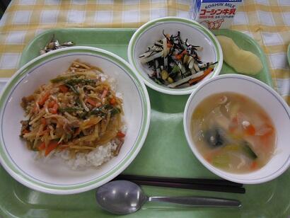 本日の給食(チンジャオロースー丼)