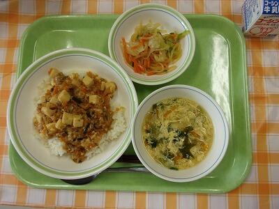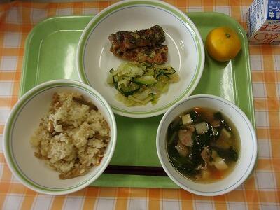 牛乳 大豆と昆布の混ぜご飯 ほっけの照り焼き(ほっけの一夜干しから変更) みそドレッシングサラダ 沢煮椀
