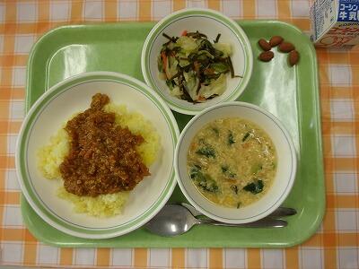 牛乳 ご飯 アーモンドと小魚の佃煮 豚肉と大根の煮物 白菜ときのこのみそ汁 白玉あずき