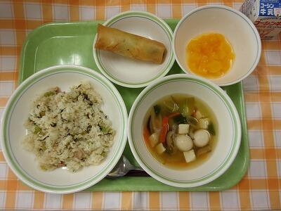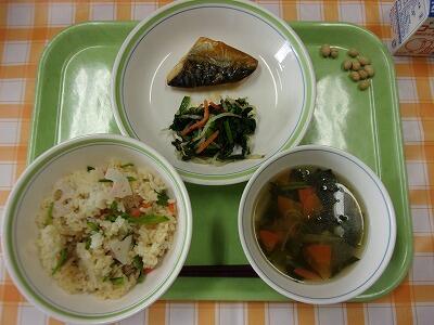 牛乳 大豆と昆布の混ぜご飯 鯖の文化干し 梅ドレッシングサラダ かきたま汁 スイートスプリング