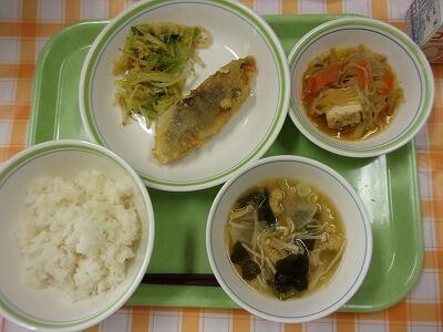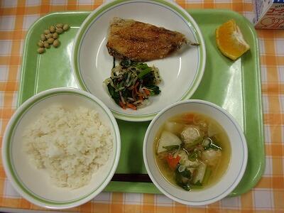 牛乳 ひじきと青大豆のご飯 鰯のさんが焼き きゅうりの土佐酢和え かぶのみそ汁 スイートスプリング