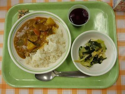 牛乳 ねぎ入りカレーライス わかめサラダ ナタデココ入りグレープゼリー 大豆小魚