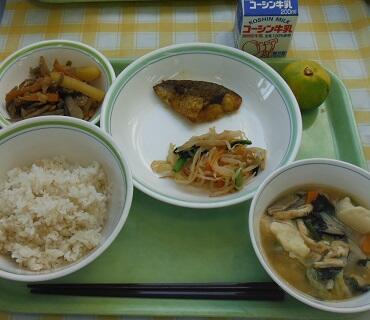 牛乳・白飯・さばのカレー焼き・からしあえ・じゃがいもの金平煮・栄養すいとん・みかん