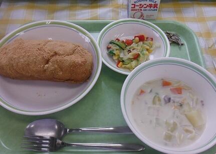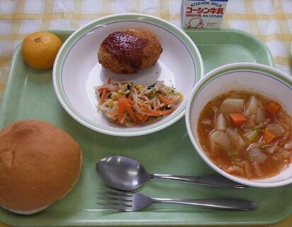 牛乳・丸パン・手作りコロッケ・ゆで野菜のごまサラダ・ミネストローネスープ・みかん