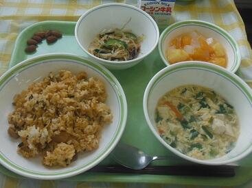 牛乳・いわしの蒲焼き・チンゲン菜のおひたし・切干大根の旨煮・かぶの味噌汁・炒りアーモンド