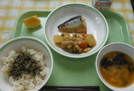 牛乳・白飯・ごまふりかけ・さばのみりん干し・豆入り筑前煮・なめこ汁・柿