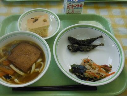 牛乳・カレーうどん・こあじのかりかり揚げ・海藻サラダ・手作り和風ホットケーキ