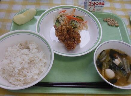 牛乳・白飯・油淋鶏・春雨サラダ・わかめのスープ・りんご・煎り大豆