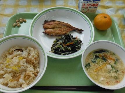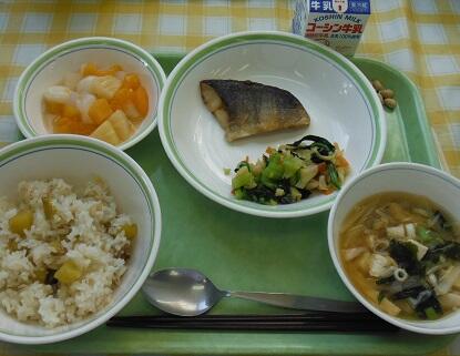 牛乳・さつまいも御飯・ほっけの一夜干し・お浸し・大根の味噌汁・フルーツ白玉・煎り大豆
