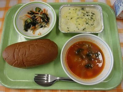 牛乳 黒パン 巻かないロールキャベツ ツナサラダ ミネストローネ