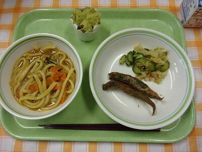 牛乳 カレーうどん ししゃもの磯辺揚げ キャベツときゅうりのごま酢和え 小倉抹茶蒸しパン
