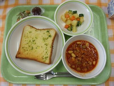 牛乳 ガーリックトースト チリコンカン マセドアンサラダ ひとくちぶどうゼリー カシューナッツ小魚