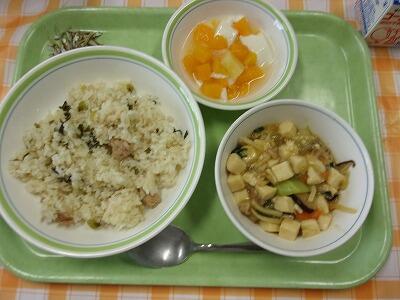 牛乳 枝豆ご飯 鰆のレモン風味揚げ みそドレッシングサラダ のっぺい汁 ぶどう