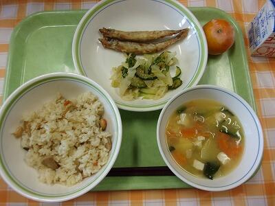 牛乳 大豆ご飯 ししゃもの唐揚げ キャベツときゅうりのごま酢和え どさんこ汁 冷凍みかん