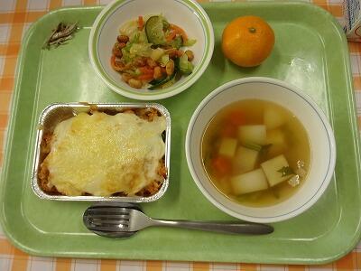 牛乳 えびピラフ なすのミートグラタン マセドアンサラダ 洋風たまごスープ ひとくちみかんゼリー