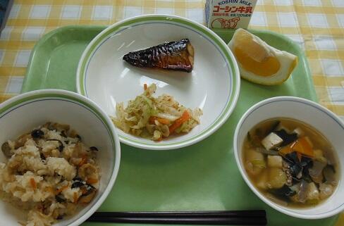 牛乳・山菜としめじのおこわ・さばのみりん干し・キャベツのごまあえ・のっぺい汁・美生柑