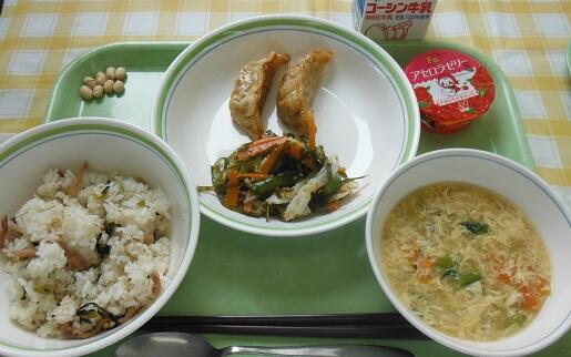 牛乳・野沢菜チャーハン・揚げ餃子・すき昆布のサラダ・中華たまごスープ・アセロラゼリー・煎り大豆