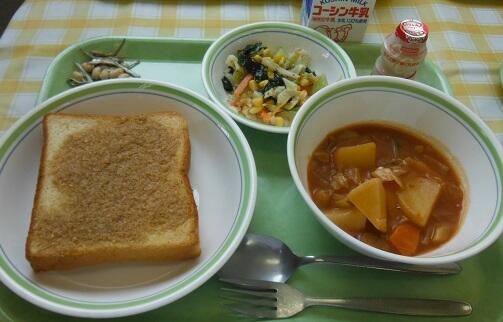 牛乳・セサミトースト・ボルシチ・わかめとコーンのサラダ・乳酸菌飲料・大豆小魚