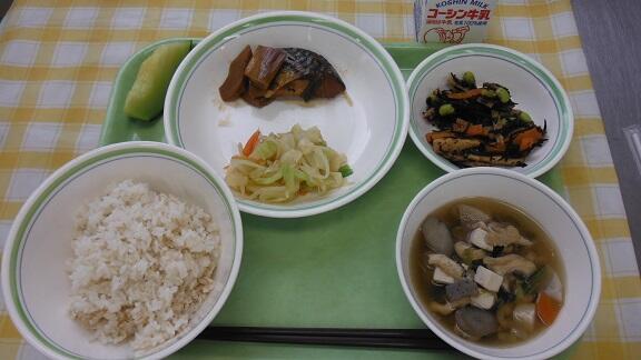 牛乳・白飯・さばの味噌煮・柚子香あえ・ひじきのピリ辛煮・けんちん汁・メロン