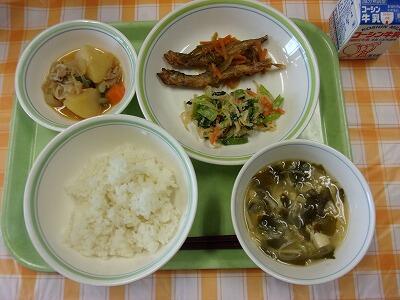 牛乳 ご飯 ししゃもの南蛮漬け アーモンド和え 肉じゃが 豆腐とわかめのみそ汁