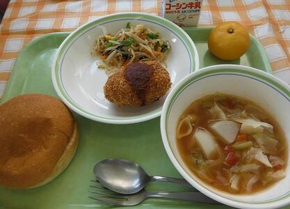 牛乳・丸パン・手作りコロッケ・ゆで野菜のごまサラダ・ミネストローネ・みかん