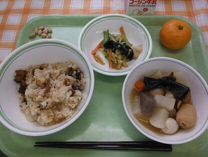 牛乳・白飯・いわしの蒲焼き・白菜の昆布漬け・きりたんぽ汁・みかん・炒りアーモンド