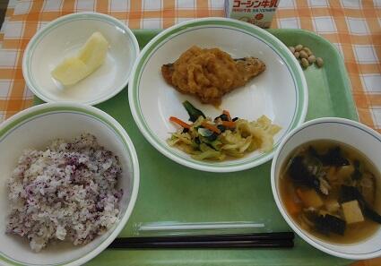 牛乳・白飯・ししゃもの磯辺揚げ・かぶの即席漬け・切干大根の旨煮・石狩汁・ふくふく豆
